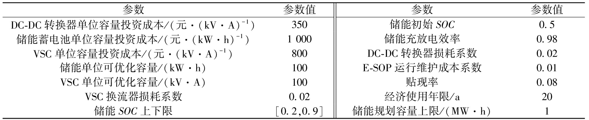 参数参数值参数参数值DC-DC转换器单位容量投资成本/(元·(kV·A)-1)350储能初始SOC0.5储能蓄电池单位容量投资成本/(元·(kW·h)-1)1 000储能充放电效率0.98VSC单位容量投资成本/(元·(kV·A)-1)800DC-DC转换器损耗系数0.02储能单位可优化容量/(kW·h)100E-SOP运行维护成本系数0.01VSC单位可优化容量/(kV·A)100贴现率0.08VSC换流器损耗系数0.02经济使用年限/a20储能SOC上下限[0.2,0.9]储能规划容量上限/(MW·h)1