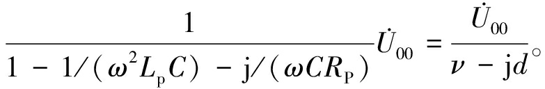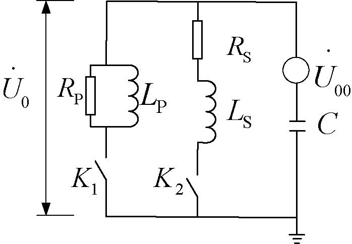 图1中,U00 为系统不对称电压;C为对地总电容;U0为中性点位移电压;K1闭合为消弧线圈并联阻尼电阻形式,对应电感Lp与电阻Rp;K2闭合则为串联阻尼电阻形式,对应电感Ls与电阻Rs。
