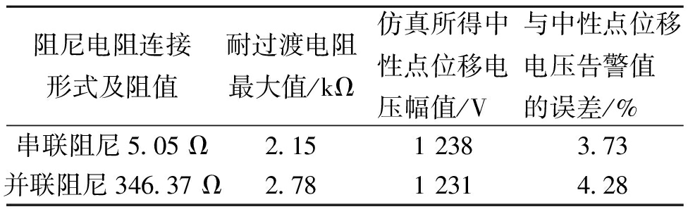 阻尼电阻连接形式及阻值耐过渡电阻最大值/kΩ仿真所得中性点位移电压幅值/V与中性点位移电压告警值的误差/%串联阻尼5.05 Ω2.151 2383.73并联阻尼346.37 Ω2.781 2314.28