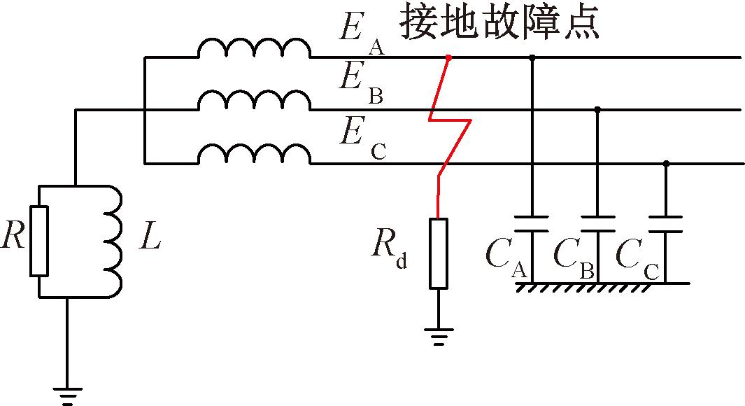 图3为单相接地故障时系统的简化电路,EA、EB、EC为系统的三相电压,O为系统中性点,L为消弧线圈电感,R为并联阻尼电阻,Rd为过渡电阻。
