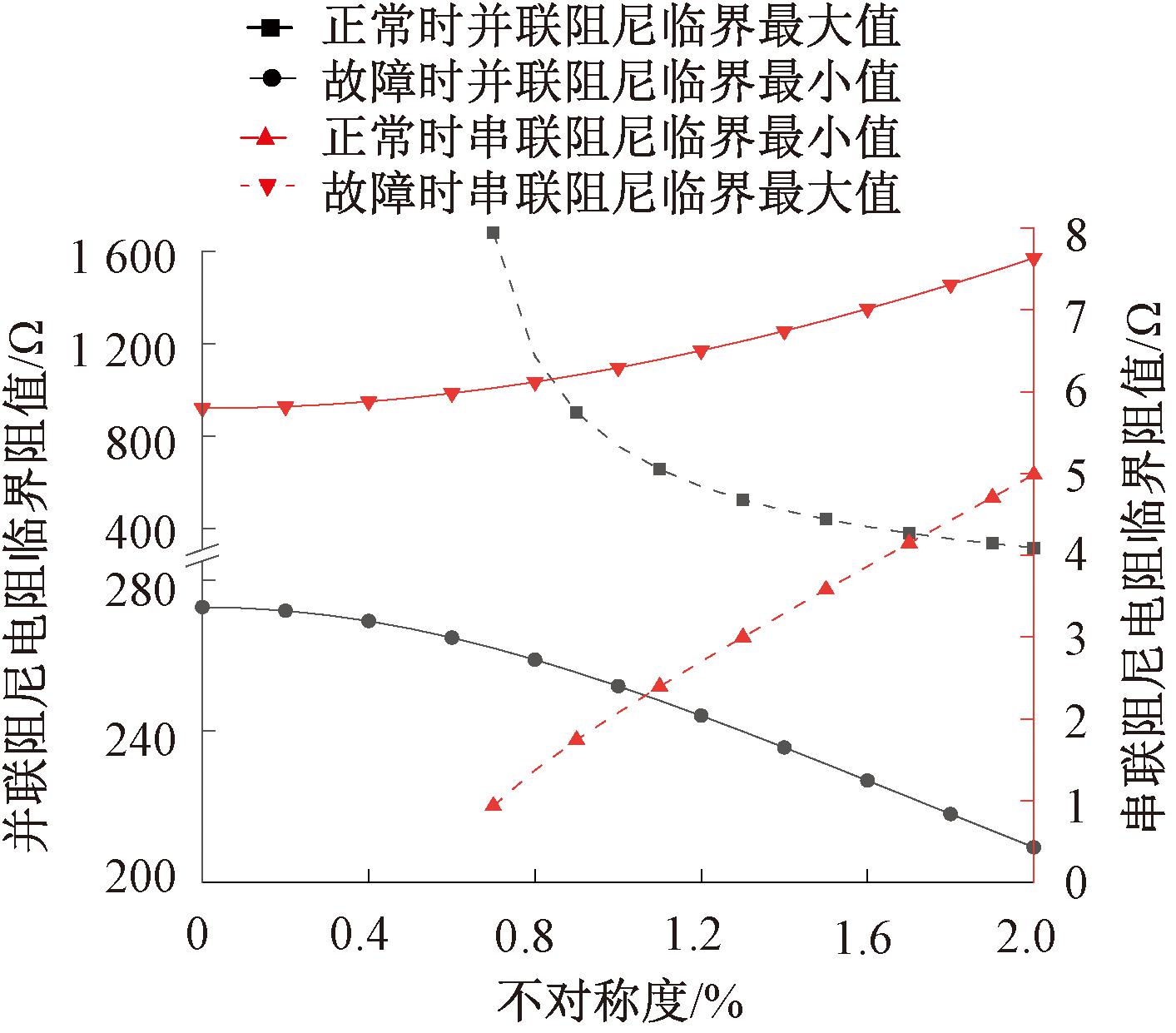 图7 阻尼电阻临界阻值与系统不对称度的变化关系曲线