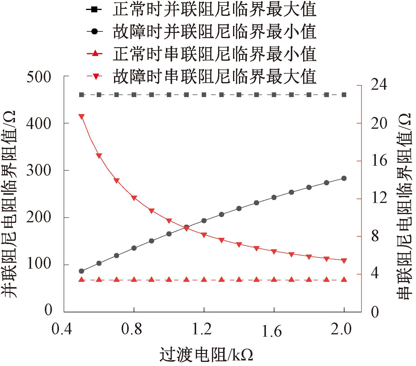 以电容电流为150 A、不对称度1.5%、4%过补偿的系统为例,绘制串、并联阻尼电阻临界阻值与过渡电阻的变化曲线,如图8所示。由图8可知,高阻接地的中性点位移电压抬升有限,需降低阻尼率,对应串联阻尼最大值下降、并联阻尼最小值上升。随着过渡电阻上升,阻尼电阻的取值范围快速收缩。过渡电阻由500 Ω上升至1 500 Ω时,并联阻尼阻值的取值范围下降39%,串联阻尼取值范围下降80%;若以耐过渡电阻2 000 Ω为目标,串联阻尼的允许区间仅余2.09 Ω,远低于并联阻尼。因此,若追求更高的耐过渡电阻能力,可将串联阻尼更换为并联阻尼,以降低系统参数变动时保护的误动率。