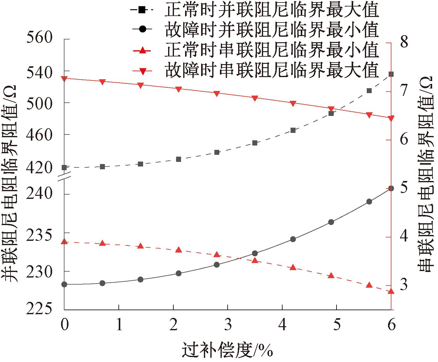 经分析,仅当过补偿度满足式(16)时,阻尼电阻才有实数值解。即在低过补偿度下,仅凭谐振点偏离无法抑制串联谐振,需接入阻尼电阻。