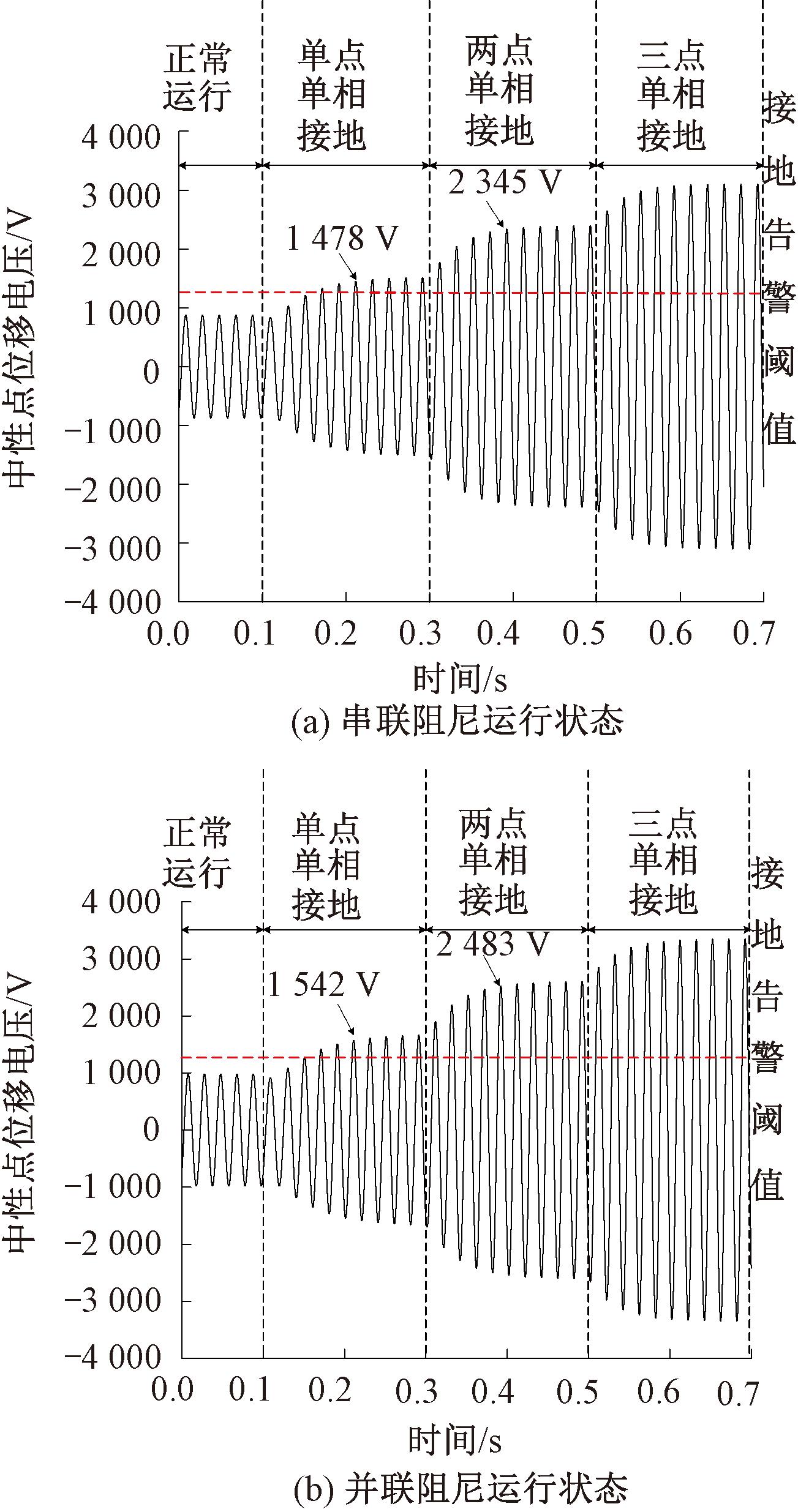 若要求系统具备1 500 Ω耐过渡电阻能力,结合3.3.1节计算与仿真结果,可选串联阻尼阻值5.05 Ω或并联阻尼346.37 Ω;母线零序电压在多点时序性接地故障对应的中性点位移电压波形图如图13所示。由图13可知,采用消弧线圈串联阻尼或并联阻尼情况下,故障后母线零序电压均能越过接地告警阈值,且多点接地对应的母线零序电压值高于单点接地对应的值,表明本文方法在多点时序性单相接地故障下依然有效。