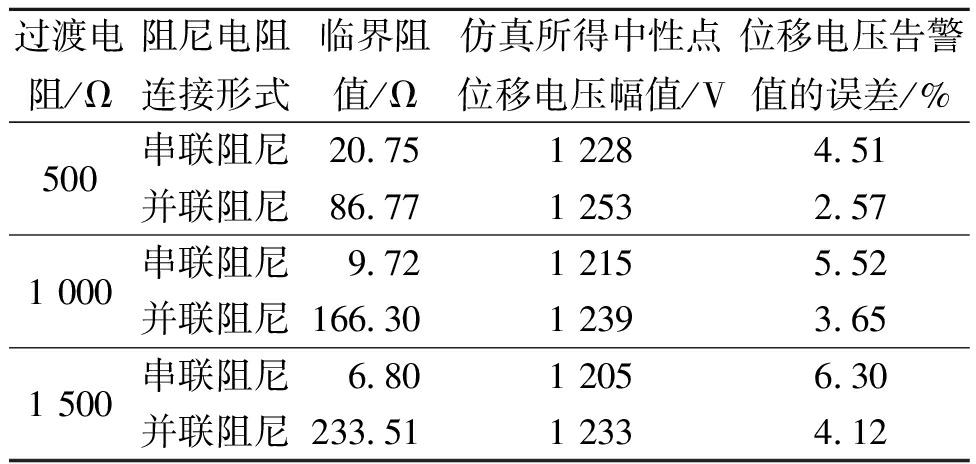 设置过渡电阻为500,1 000,1 500 Ω,计算恰好使中性点位移电压越过选线装置启动门槛的阻尼电阻值,不同过渡电阻下阻尼电阻临界阻值和仿真结果见表3。由表3可知,本文方法能较为准确地计算不同工况下的临界阻尼电阻,对应中性点位移电压仿真值与15%相电压的告警门槛值差距均在10%以内。随过渡电阻提升,串联阻尼最大取值逐渐降低、并联阻尼最小取值逐渐升高,二者都逐渐靠近正常运行下的临界取值。
