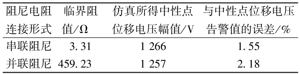 计算正常运行时使中性点位移电压达到告警值的阻尼电阻临界阻值,并代入仿真模型验证中性点位移电压是否达到告警值,阻尼电阻临界阻值和仿真结果见表2。