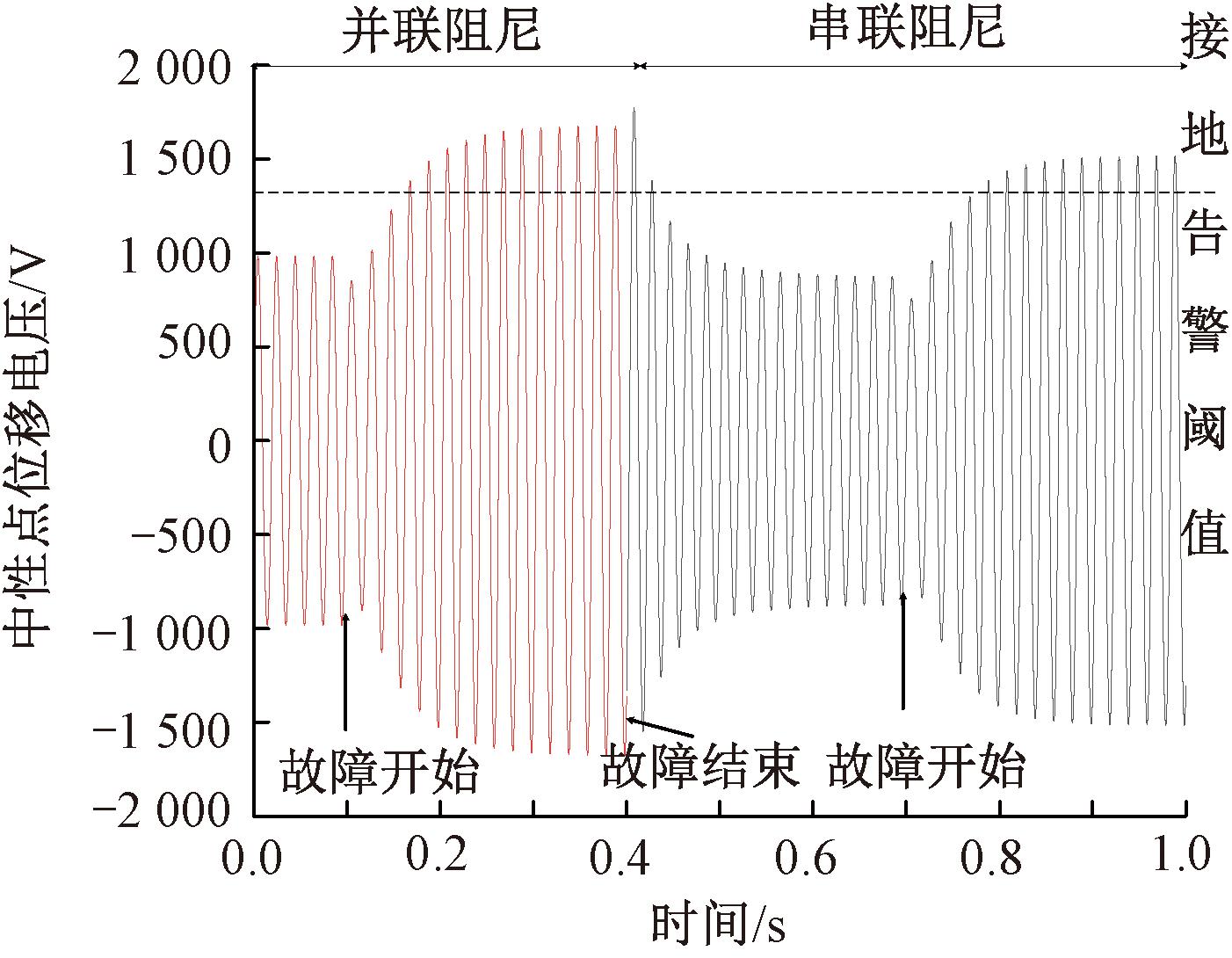 若系统在正常运行保护不误动的前提下,在1 500 Ω单相接地故障下仍能可靠动作,可选择阻尼电阻阻值上下限的中点值,即并联阻尼346.37 Ω或串联阻尼5.05 Ω,对应中性点位移电压波形图如图11所示。可知本文方法可以满足既定目标要求。