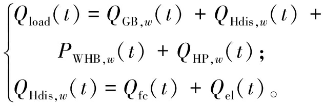 式中:QHdis,w、Qfc、Qel分别为t时刻氢储能电站传输给微网的热功率以及燃料电池和电解槽释放的热功率;PWHB,w、QHP,w、Qload分别为t时刻余热锅炉输出功率、热泵产热功率和热负荷。