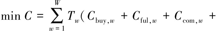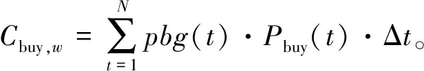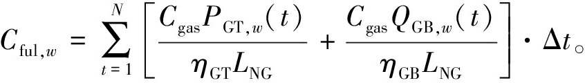 式中:Cgas为燃气的单位体积价格,元/m3;PGT,w为燃气轮机在t时刻的输出功率;ηGT为燃气轮机的发电效率;QGB,w为燃气锅炉在t时刻的输出热功率;QGB,w为燃气锅炉的效率。