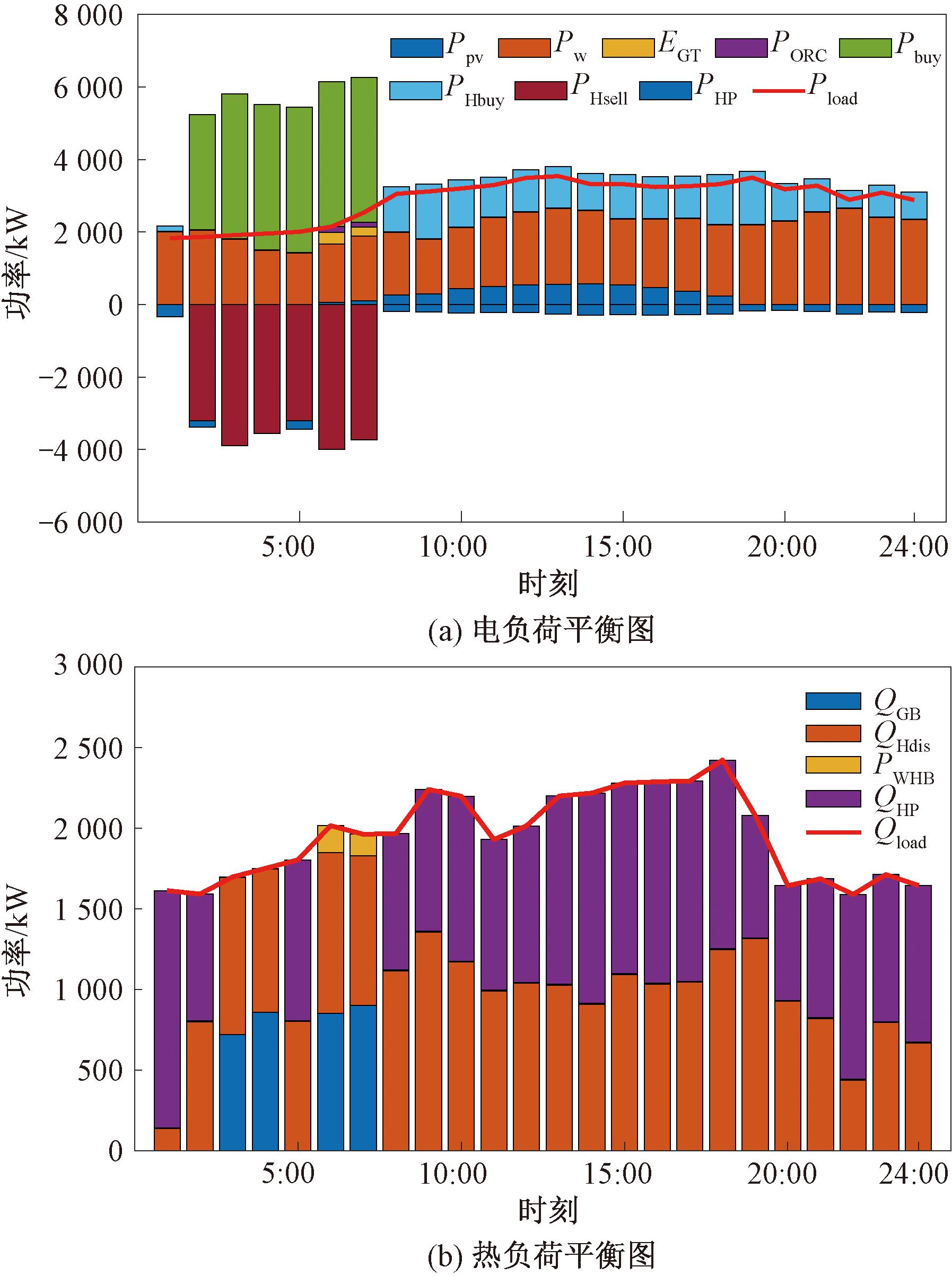 先以夏季为例,场景3的电热负荷平衡如图10所示。图10及图11中,图标Ppv为光伏发电功率;PW为 风力发电功率;EGT为燃气轮机发电功率;PORC为低温余热装置发电功率;Pbuy为从电网购电功率;PHbuy为从储能电站购电功率;PHsell为向储能电站售电功率;PHP为热泵消耗电功率;Pload为电负荷;QGB为燃气锅炉供热功率;QHdis为储能电站输出热功率;PWHB为余热锅炉输出热功率;QHP为热泵产热功率;Qload为热负荷。早间电价便宜时,从电网购电并出售给氢储能电站制氢,以氢能的形式存储在储氢罐。在中午光伏发电和风力发电占据主力,不足的从氢储能电站购入。在夜间热负荷需求相对白天增大,主要由热泵、余热锅炉、氢储能电站共同满足,因为这时电负荷需求不大,可以从氢储能电站购买电能,节约成本。