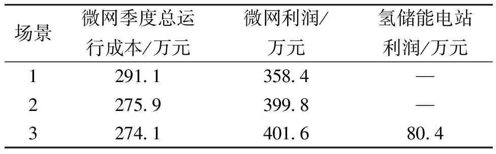 这里以冬季为例,分析3种场景的微网的季度运行总成本以及利润,见表3。