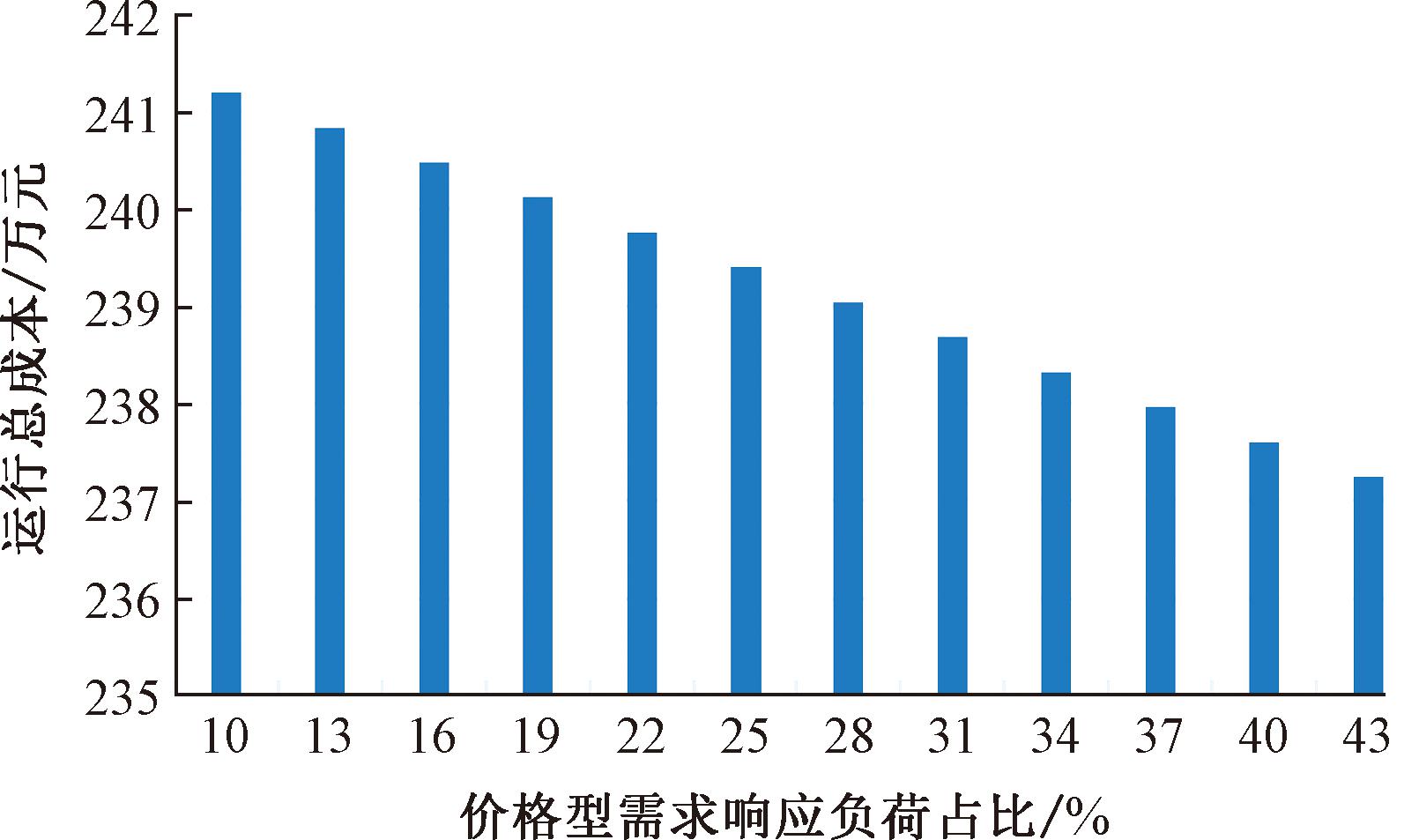 (1)可替代型负荷占比5%保持不变,研究价格型即可消减、可转移负荷占比对结果的影响。设置可消减和可转移负荷之比为1∶2,保持比例不变,改变两者在总的负荷占比从10%到43%变化,结果如图8所示。从图8可以看出,随着价格型负荷占比的提升,场景2下微网的运行总成本逐渐下降,呈负相关性。原因较明显,增大价格型负荷占比能减少或转移高峰电价时段用电负荷,并调整到低电价时段。即通过负荷消减和转移降低了购能成本,实现了总运行成本降低。