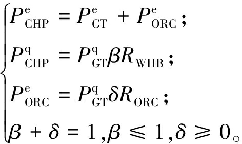 分别为燃气轮机发电功率、发热功率以及低温余热装置发电功率;β为余热分配系数,表示将燃气轮机产出的热量分配给余热锅炉的占比;δ为分配给低温余热装置用以发电的占比;RWHB和RORC分别为余热锅炉和低温余热装置热转换效率。
