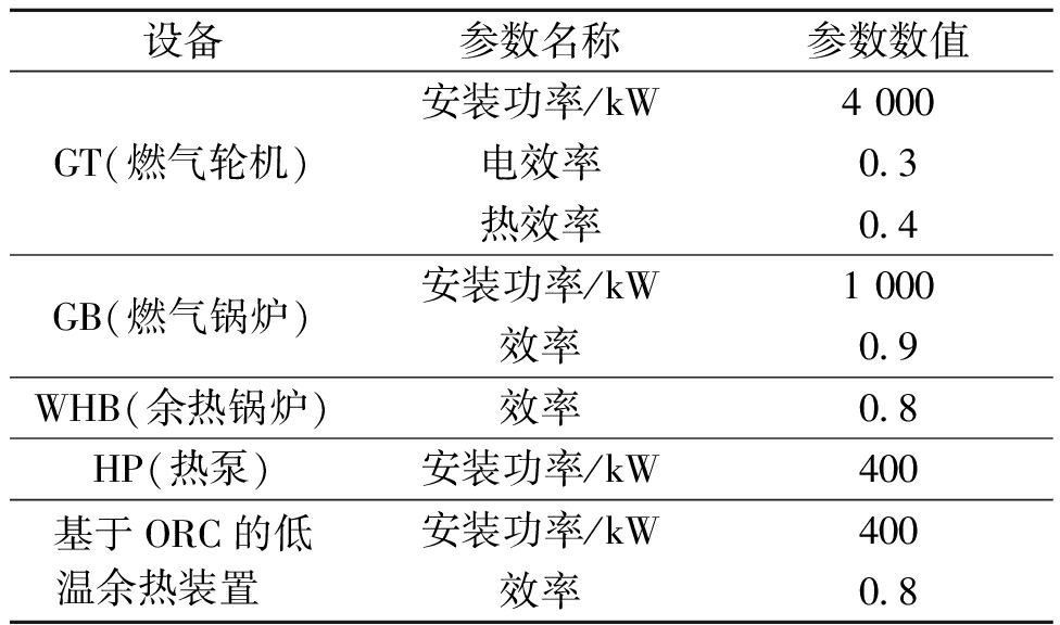 设备参数名称参数数值GT(燃气轮机)安装功率/kW4 000电效率0.3热效率0.4GB(燃气锅炉)安装功率/kW1 000效率0.9WHB(余热锅炉)效率0.8HP(热泵)安装功率/kW400基于ORC的低温余热装置 安装功率/kW400效率0.8