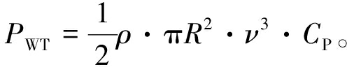 式中:ρ表示空气密度,一般可取值为1.25 kg/m3;ν表示风轮机的风速;CP表示风能利用系数;R表示风轮机的半径[14]。