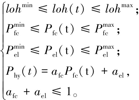 分别为电解槽功率上、下限;Phy为氢能系统在时刻t的产电功率;afc、ael分别为燃料电池、电解槽的工作标志位,取0或1。