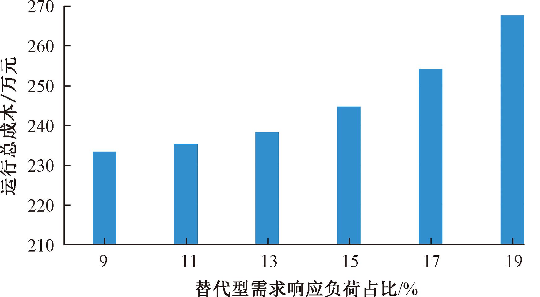 (2)保持价格型负荷占比不变,研究可替代型负荷对于运行总成本的影响。设置可消减和可转移负荷占比分别为15%和30%,改变可替代型负荷占比为9%~19%,结果如图9所示。从图9可以看出,在9%~19%内,场景2的总运行成本随着替代型负荷占比的提升而升高,呈现正相关性。这是因为替代性负荷占比的增加会导致制热设备的运行和维护成本等费用的增加,超过了节省的电费导致总成本的升高。