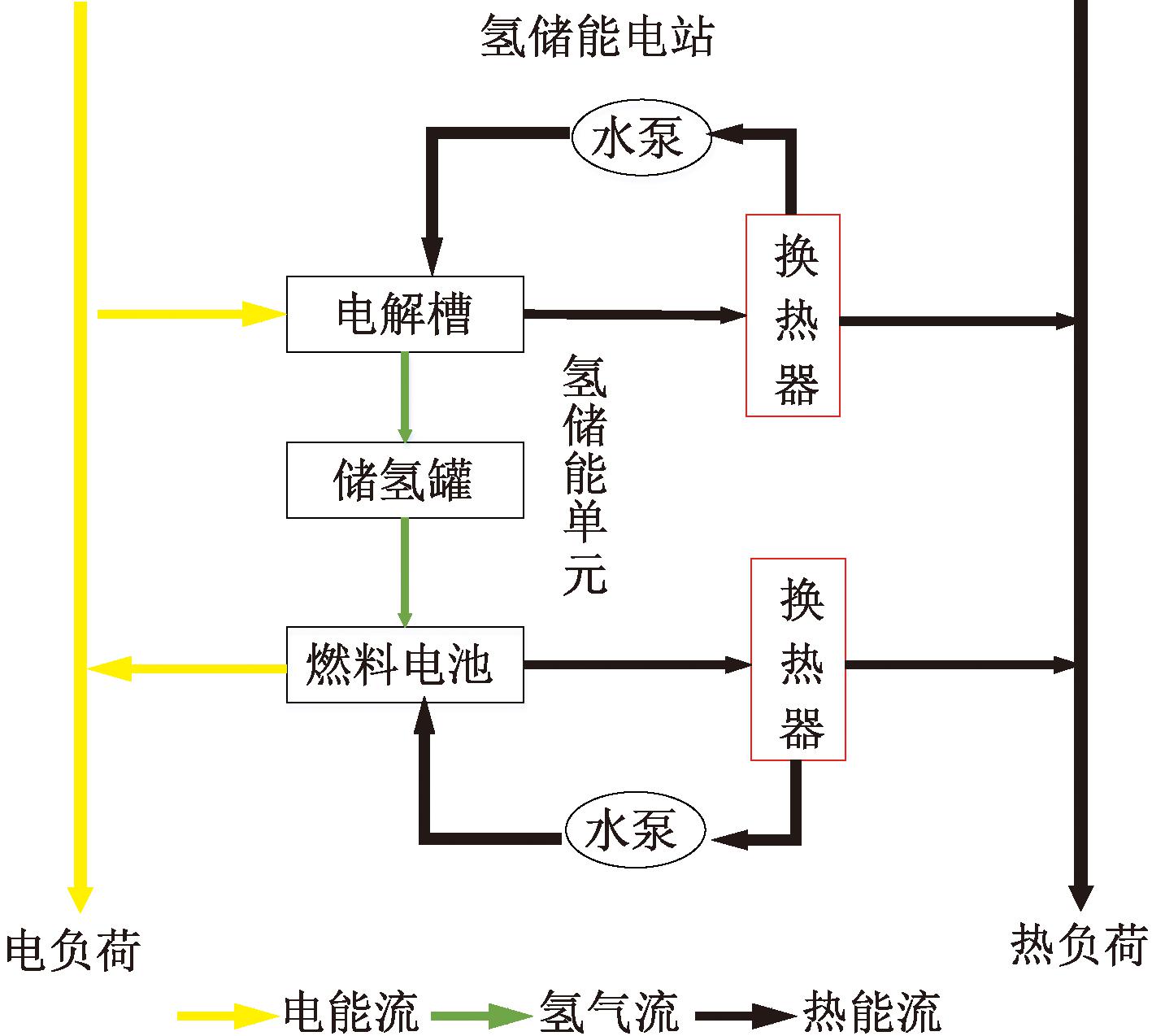 氢储能电站结构如图2所示。氢作为一种清洁能源,把氢储能引入综合能源系统,可实现高效运行和提升风光消纳,也可解决风光发电与用电在时间与空间上不匹配的问题。同时,考虑目前氢能系统转换效率还较低,可合理利用燃料电池和电解槽工作时产生的热能来提高能源利用率。