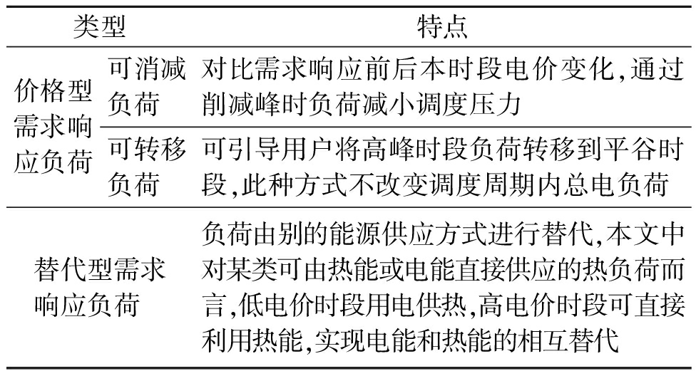 传统需求响应一般采用价格信号激励用户主动改变用电习惯实现峰谷调节[17]。本文构建模型除了电负荷调节,还有热负荷参与,热力具有温度变化时滞性(从热源到用户通过管道传递,供热网传热有较长时延)。故将需求响应分为两部分:价格型和负荷替代型[18],具体见表1。根据各自负荷的特性进行建模。