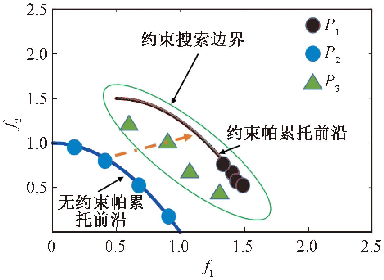 现有方法仅在环境选择过程中分享子代个体完成信息分享,然而,这种方式未能充分利用不同种群的信息产生高质量的杂交子代[20]。如图2所示,小可行域导致P1收敛至局部约束帕累托前沿上。虚线箭头是由P2的个体和P3的个体产生的搜索方向,由该搜索方向产生的子代个体可以定位于小可行域上。因此,基于种群合作的子代产生方式能提供更多的搜索多样性,有助于种群跳出局部最优。基于此,本节设计了基于父代聚合的交配父代选择策略。