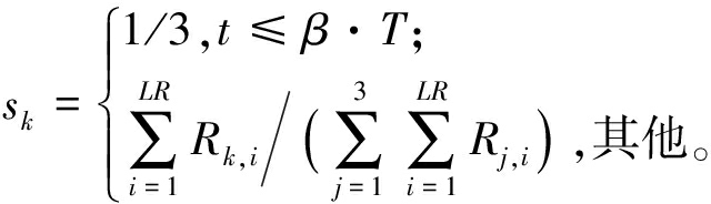 式中:T为最大进化代数;参数β控制选择概率的更新方式。在进化前期,每个任务有相同的选择概率,使得每个任务都能被选中以评估其表现;在进化后期,种群在历史过程中的表现奖励被用于更新选择概率,使得适合当前环境的任务能被更频繁地选中,从而发挥此任务种群的效果,避免低效种群浪费计算资源。