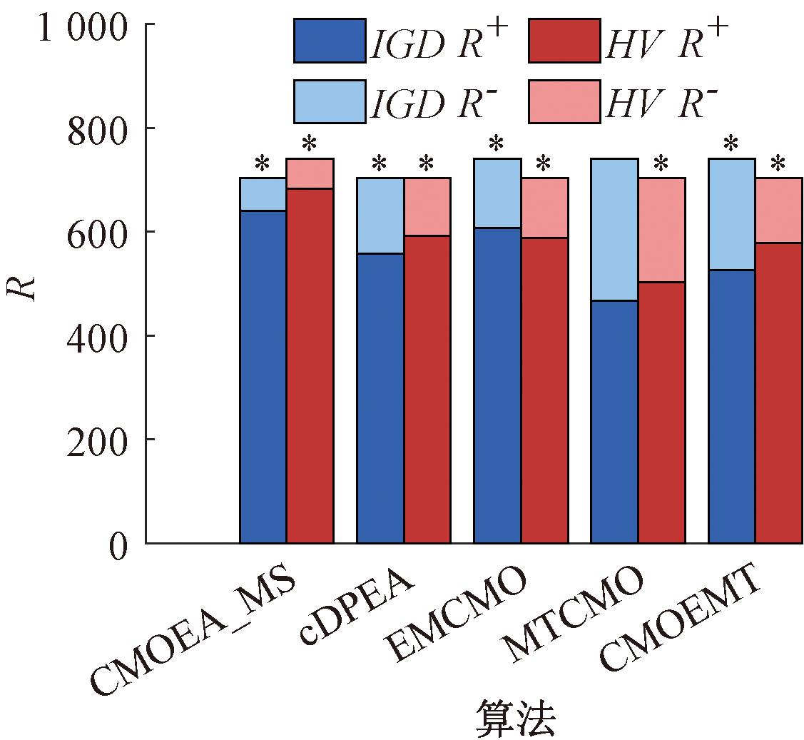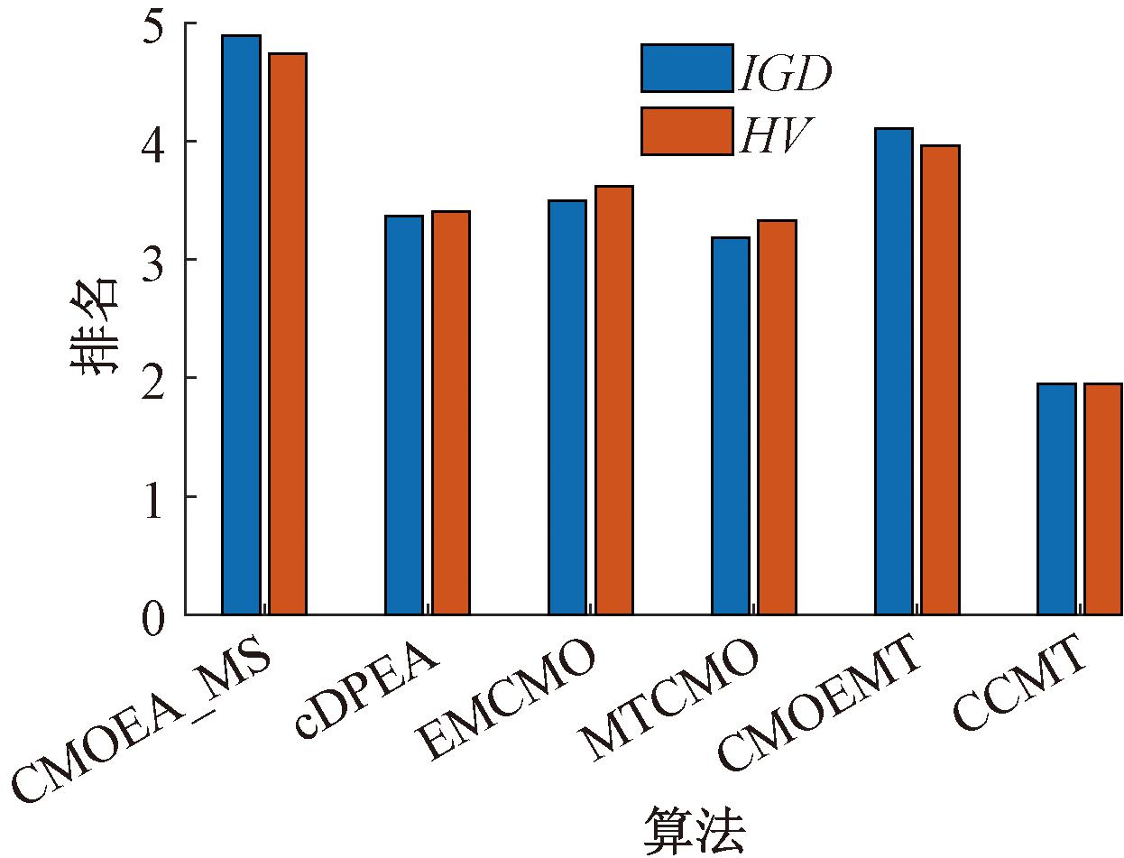 图4提供了所有算法在所有测试函数上的统计对比结果,其中R+和R-分别代表CCMT和对比算法的表现,符号“*”代表两个算法之间存在显著差异。对于每个对比算法,R+明显大于R-,并且除了MTCMO在IGD指标上与CCMT未存在显著差异,其余所有算法在两个指标上均与CCMT存在显著差异,证明CCMT显著优于对比算法。图5提供了每个算法基于Friedman检验的平均排名,CCMT取得了最优的排名。