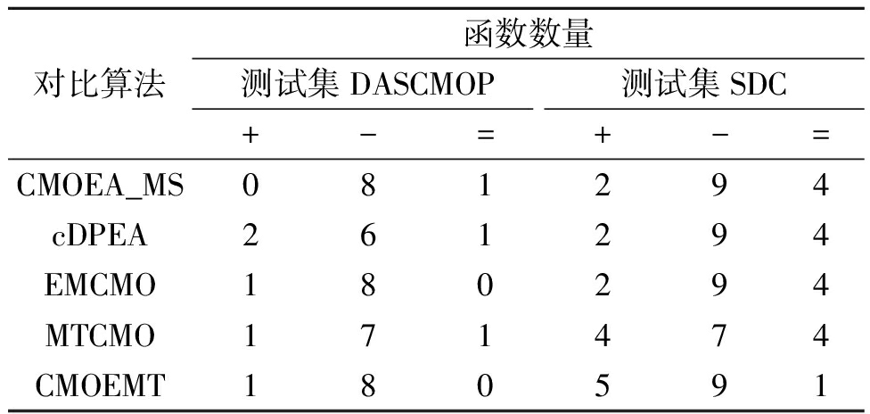 表2 在DASCMOP和SDC测试集上,基于IGD指标对比算法优于、差于或等于CCMT的函数数量