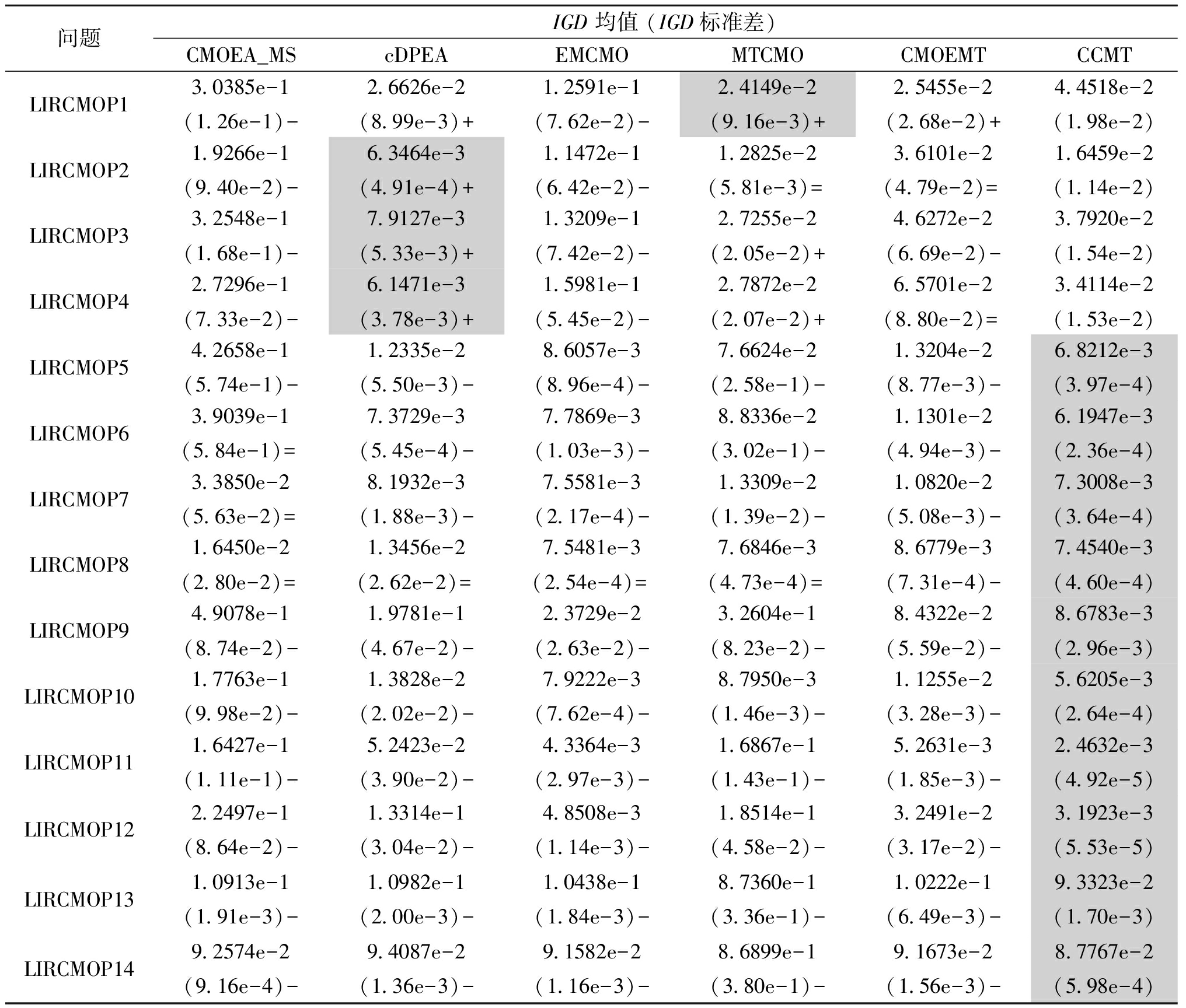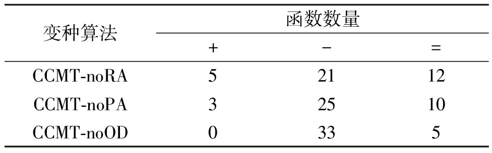 注:括号后的符号“+”、“-”及“ =”分别表示对比算法显著好于、明显差于和相似于CCMT,下同。