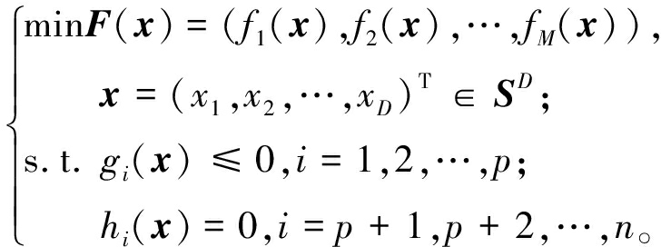 式中:f(x) 代表单个优化目标;F(x)代表一个M维的优化目标向量;x代表一个D维决策向量;SD代表决策空间;g(x)和h(x)分别代表不等式约束和等式约束;p和(n-p)分别代表不等式约束和等式约束的数量。