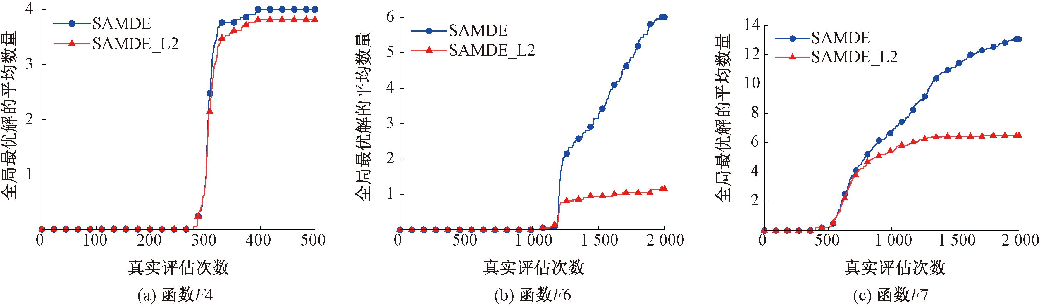 图4 全局最优解的平均数量随真实评价次数变化曲线图
