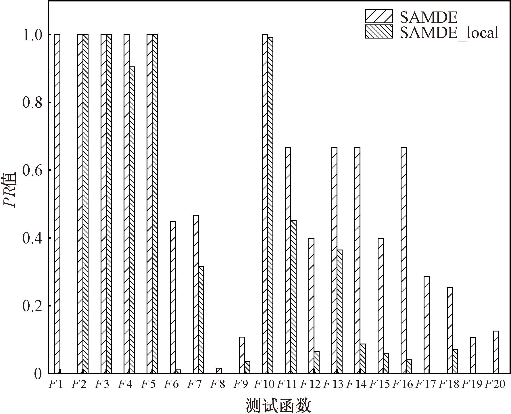 (1)全局搜索有效性验证。在本实验中,SAMDE在所有测试函数中与其变体SAMDE_local进行比较来验证全局搜索寻找多模态解的能力。图2展示了在相同条件下两种算法在相同精度下的PR值。从图2中可以看出,SAMDE在每个测试问题上所找到的多模态解的数量远优于SAMDE_local。此外,SAMDE可以找到F1~F5以及F10的所有全局最优解。上述分析验证了全局搜索寻找多模态解的能力。