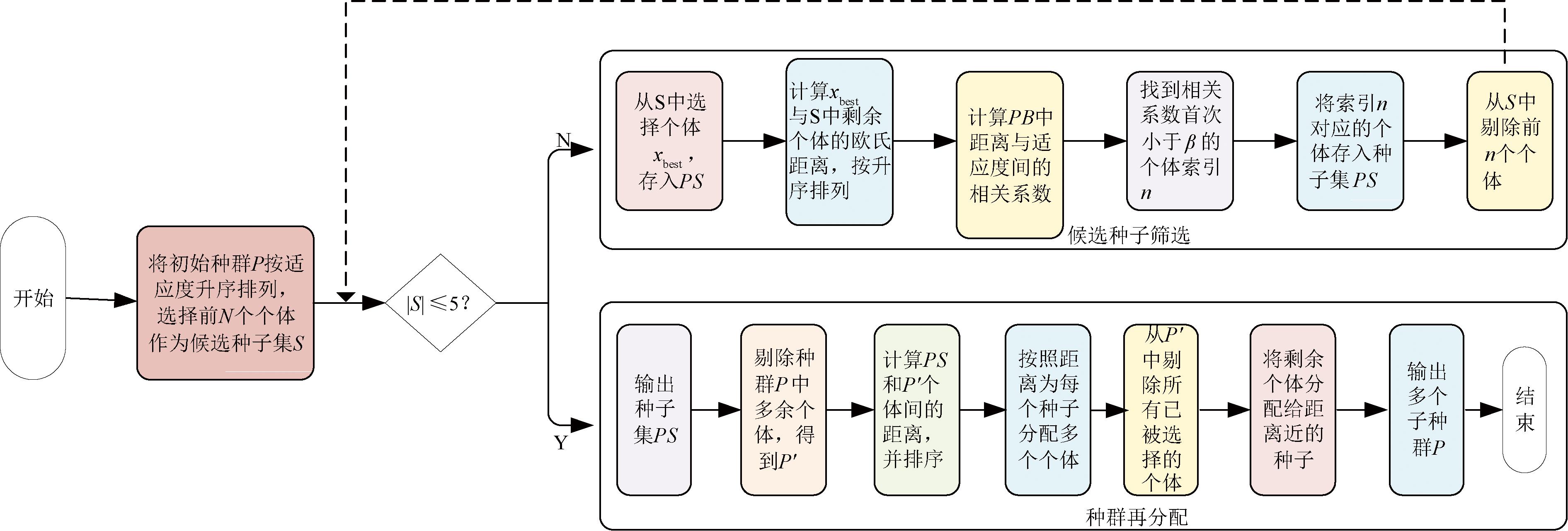 为保证模态信息都尽可能地被探索,为每个种子重新分配了种群。首先将PS中的个体从种群P中剔除得到P′。然后计算每个种子到P′的距离并按照升序排列,每个种子被分配距离最近的前|P|/|PS|个个体作为其对应的子种群,注意每个子种群之间可能有重复的个体。最后将所选择的所有个体进一步从P′中剔除,剩余个体被分配到距离最近的种子,输出多个子种群P。