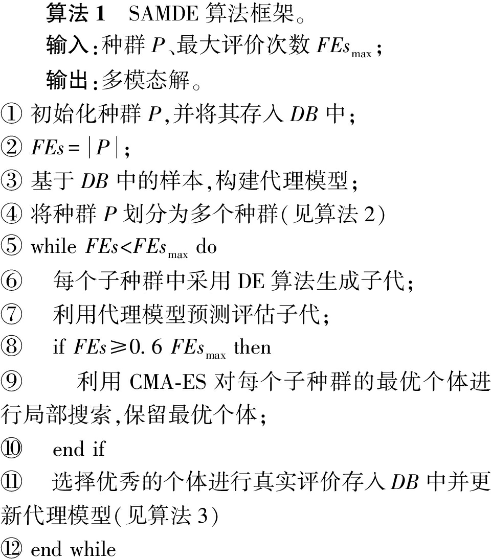 算法1 SAMDE算法框架。 输入:种群P、最大评价次数FEsmax; 输出:多模态解。① 初始化种群P,并将其存入DB中;② FEs=P;③ 基于DB中的样本,构建代理模型;④ 将种群P划分为多个种群(见算法2)⑤ while FEs