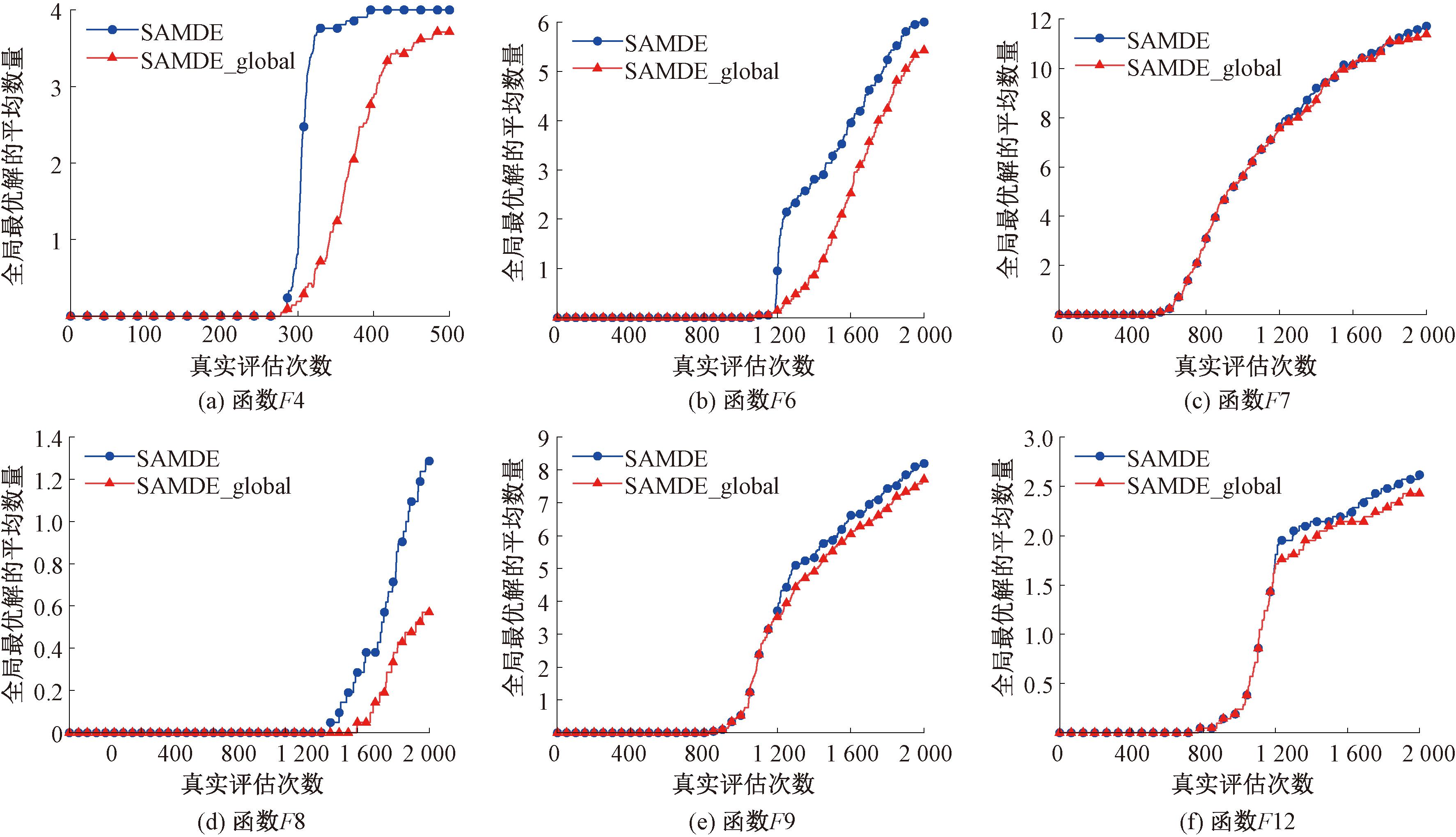 (2)局部搜索有效性验证。与单模态优化问题不同,多模态优化问题要保证找到的多个最优解都要逼近真实值。所以,为了验证局部搜索对于算法收敛性的影响,本节采用找到的全局最优解平均数来衡量算法的收敛性能[12]。图3展示了在相同条件下6个测试函数的全局最优解的平均数量随真实评价次数变化曲线图。从图3可以看出,在算法后期,SAMDE找到的全局最优解的数量始终优于其变体SAMDE_global。主要原因是在算法后期局部搜索的加入提高了全局搜索找到的全局最优解的质量。上述分析验证了局部搜索算法收敛性的能力。