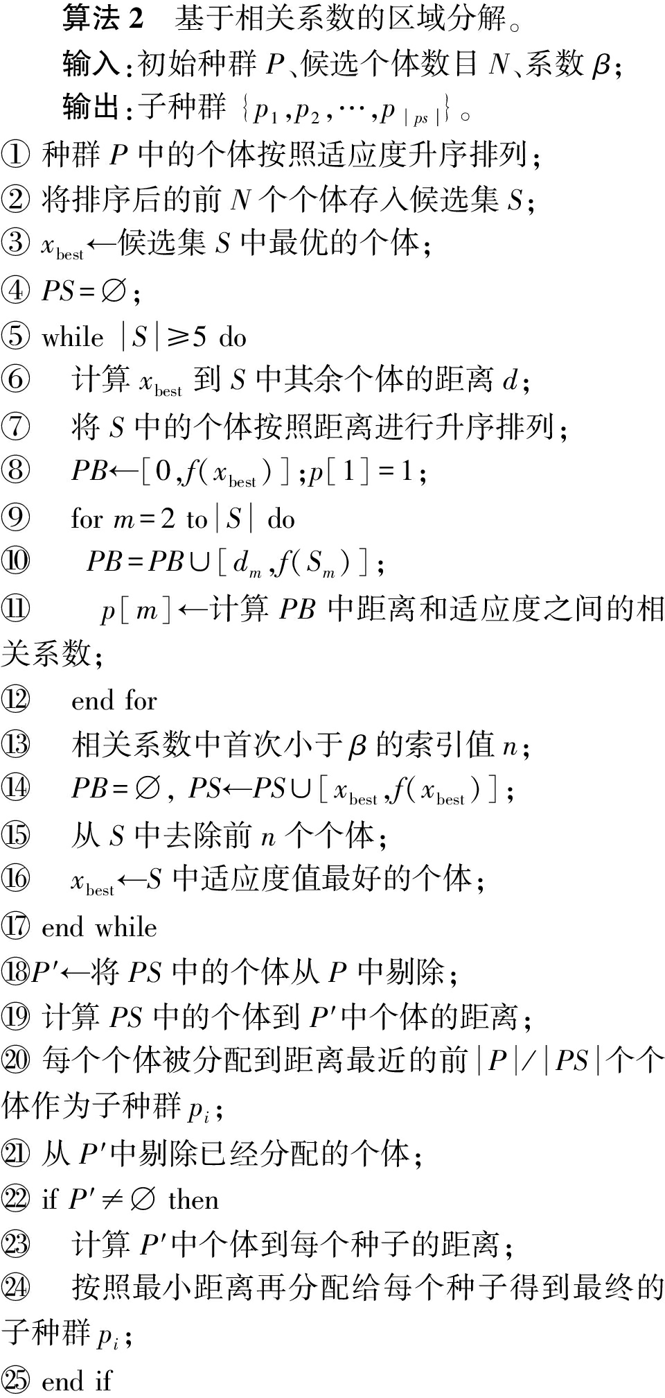 算法2 基于相关系数的区域分解。 输入:初始种群P、候选个体数目N、系数 β; 输出:子种群 {p1,p2,…,pps}。① 种群P中的个体按照适应度升序排列;② 将排序后的前N个个体存入候选集S;③ xbest←候选集S中最优的个体;④ PS=⌀;⑤ while S≥5 do⑥ 计算xbest到S中其余个体的距离d;⑦ 将S中的个体按照距离进行升序排列;⑧ PB←[0,f(xbest)];p[1]=1;⑨ for m=2 toS do⑩ PB=PB∪[dm,f(Sm)]; p[m]←计算PB中距离和适应度之间的相关系数; end for 相关系数中首次小于β的索引值n; PB=⌀, PS←PS∪[xbest,f(xbest)]; 从S中去除前n个个体; xbest ←S中适应度值最好的个体; end whileP′←将PS中的个体从P中剔除; 计算PS中的个体到P′中个体的距离; 每个个体被分配到距离最近的前P/PS个个体作为子种群pi; 从P′中剔除已经分配的个体; if P′≠⌀ then 计算P′中个体到每个种子的距离; 按照最小距离再分配给每个种子得到最终的子种群pi; end if