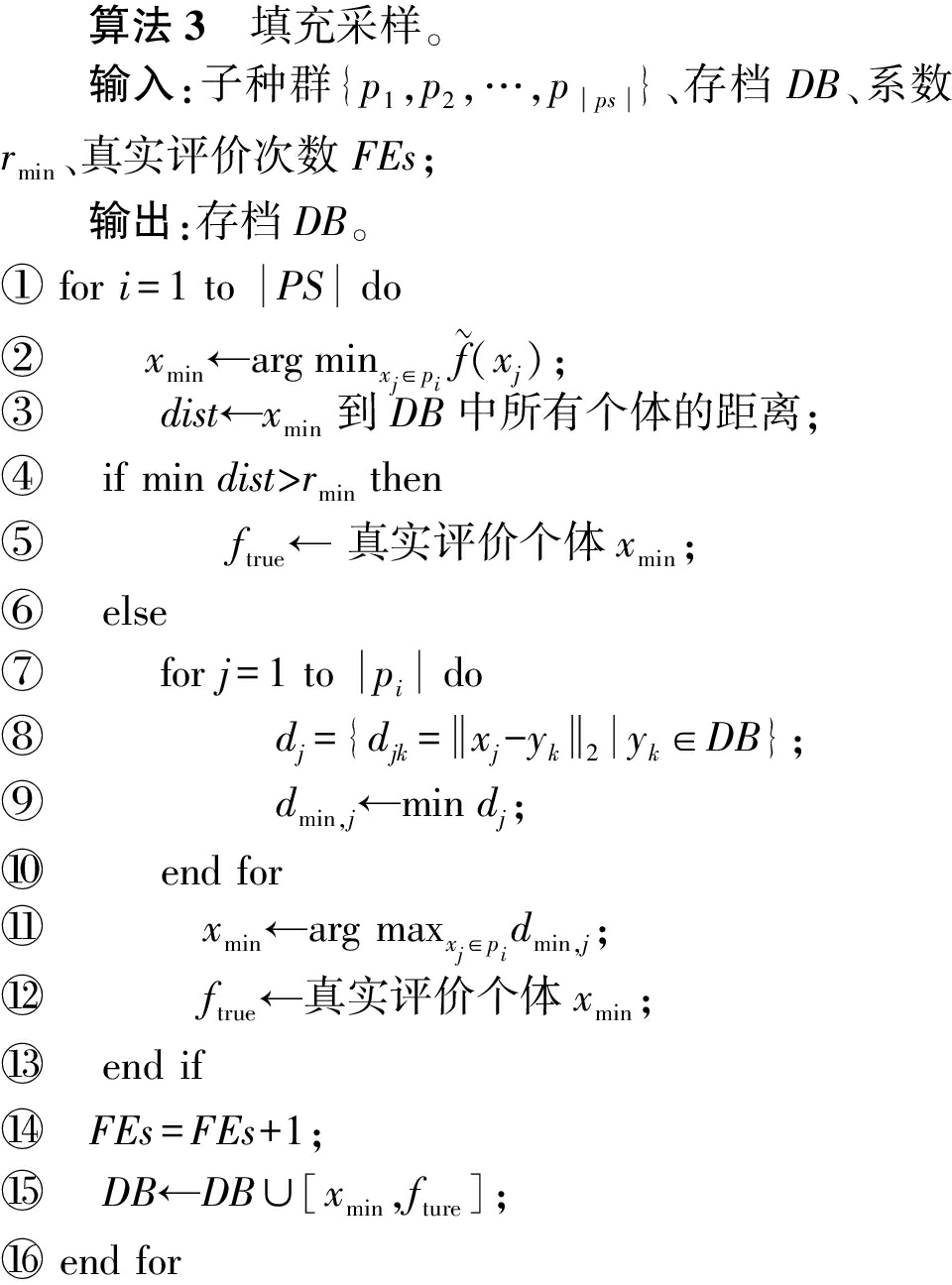 算法3 填充采样。 输入:子种群{p1,p2,…,pps}、存档DB、系数rmin、真实评价次数FEs; 输出:存档DB。① for i=1 to PS do② xmin←argminxj∈pi f(xj);③ dist←xmin到DB中所有个体的距离;④ if mindist>rminthen⑤ ftrue← 真实评价个体xmin;⑥ else⑦ for j=1 to pi do⑧ dj={djk=xj-yk2yk∈DB};⑨ dmin,j←mindj;⑩ end for xmin←arg maxxj∈pidmin,j; ftrue←真实评价个体xmin; end if FEs=FEs+1; DB←DB∪[xmin,fture]; end for