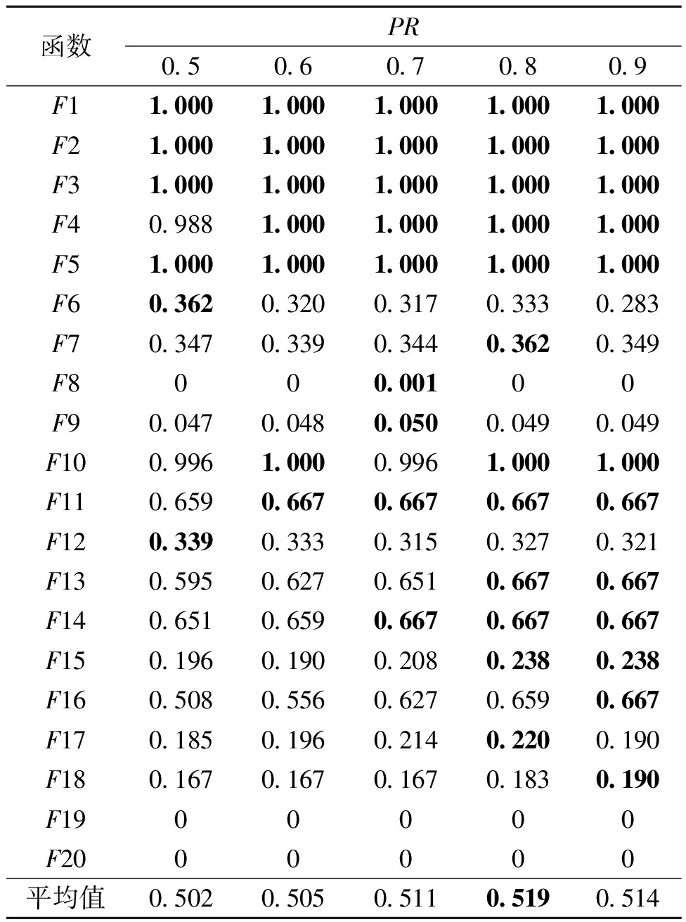 函数PR0.50.60.70.80.9F11.0001.0001.0001.0001.000F21.0001.0001.0001.0001.000F31.0001.0001.0001.0001.000F40.9881.0001.0001.0001.000F51.0001.0001.0001.0001.000F60.3620.3200.3170.3330.283F70.3470.3390.3440.3620.349F8000.00100F90.0470.0480.0500.0490.049F100.9961.0000.9961.0001.000F110.6590.6670.6670.6670.667F120.3390.3330.3150.3270.321F130.5950.6270.6510.6670.667F140.6510.6590.6670.6670.667F150.1960.1900.2080.2380.238F160.5080.5560.6270.6590.667F170.1850.1960.2140.2200.190F180.1670.1670.1670.1830.190F1900000F2000000平均值0.5020.5050.5110.5190.514