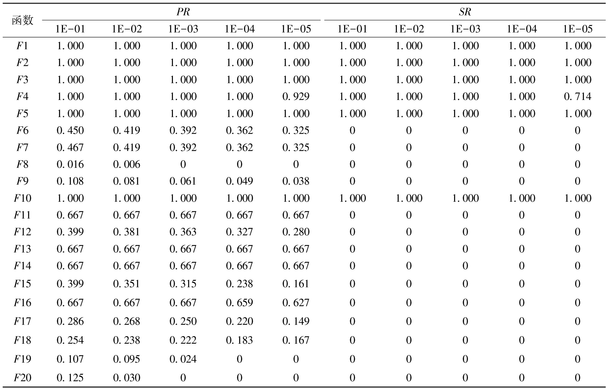 函数PRSR1E-011E-021E-031E-041E-051E-011E-021E-031E-041E-05F11.0001.0001.0001.0001.0001.0001.0001.0001.0001.000F21.0001.0001.0001.0001.0001.0001.0001.0001.0001.000F31.0001.0001.0001.0001.0001.0001.0001.0001.0001.000F41.0001.0001.0001.0000.9291.0001.0001.0001.0000.714F51.0001.0001.0001.0001.0001.0001.0001.0001.0001.000F60.4500.4190.3920.3620.32500000F70.4670.4190.3920.3620.32500000F80.0160.00600000000F90.1080.0810.0610.0490.03800000F101.0001.0001.0001.0001.0001.0001.0001.0001.0001.000F110.6670.6670.6670.6670.66700000F120.3990.3810.3630.3270.28000000F130.6670.6670.6670.6670.66700000F140.6670.6670.6670.6670.66700000F150.3990.3510.3150.2380.16100000F160.6670.6670.6670.6590.62700000F170.2860.2680.2500.2200.14900000F180.2540.2380.2220.1830.16700000F190.1070.0950.0240000000F200.1250.03000000000